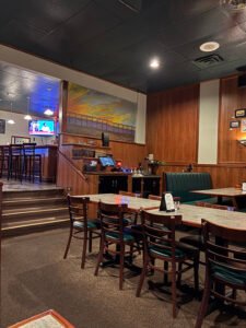 Dining out area at Cayuga St Steakhouse: Main room is filled with green-backed booths and wooden chairs, a mostly wooden interior with local art for sale hanging on the walls.
