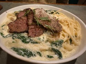 The menu features steaks, other protein-focused entrees, pasta dishes, sandwiches, salads and burgers as well as a handful of appetizers. There’s a good selection of American foods, with not too much attention given to dietary restrictions in case that is a concern.