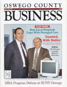 The SUNY Oswego MBA program was launched in the fall 1997, spearheaded by then-dean Lanny Karns and graduate studies director Charles Spector. They both appeared on the cover of the April/May 1997 issue of Oswego County Business Magazine.